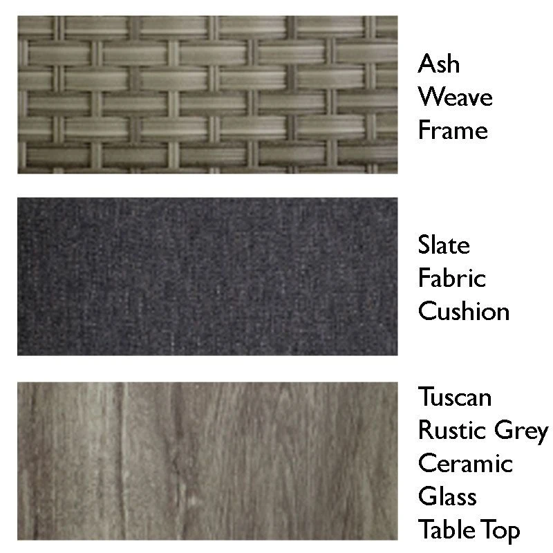 | Frame & Cushion Colour | Ash Rattan Weave finish Slate fabric cushion Rustic Grey Tuscan ceramic glass table top |
