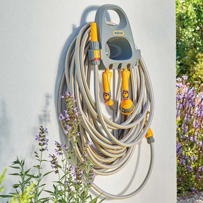 This Hozelock garden hose hanger is an ideal choice for storing your garden hose, it is a robust and durable product that will last years. It can hold hoses of a width of 19 mm with a length of up to 30 meters and 12.5 mm garden hoses of up to 50 meters in length. The hose hanger features a drip-free storage point for spray guns, sprinklers or connectors and has an added storage compartment at the front for other gardening tools. This product is a great addition to your garden.