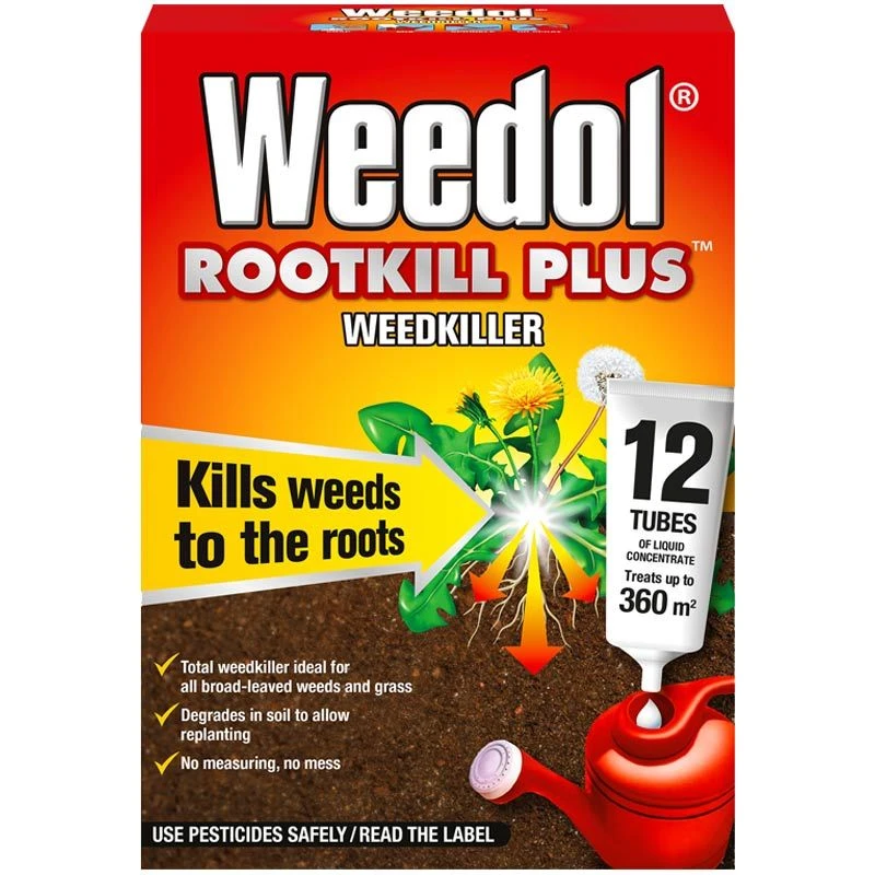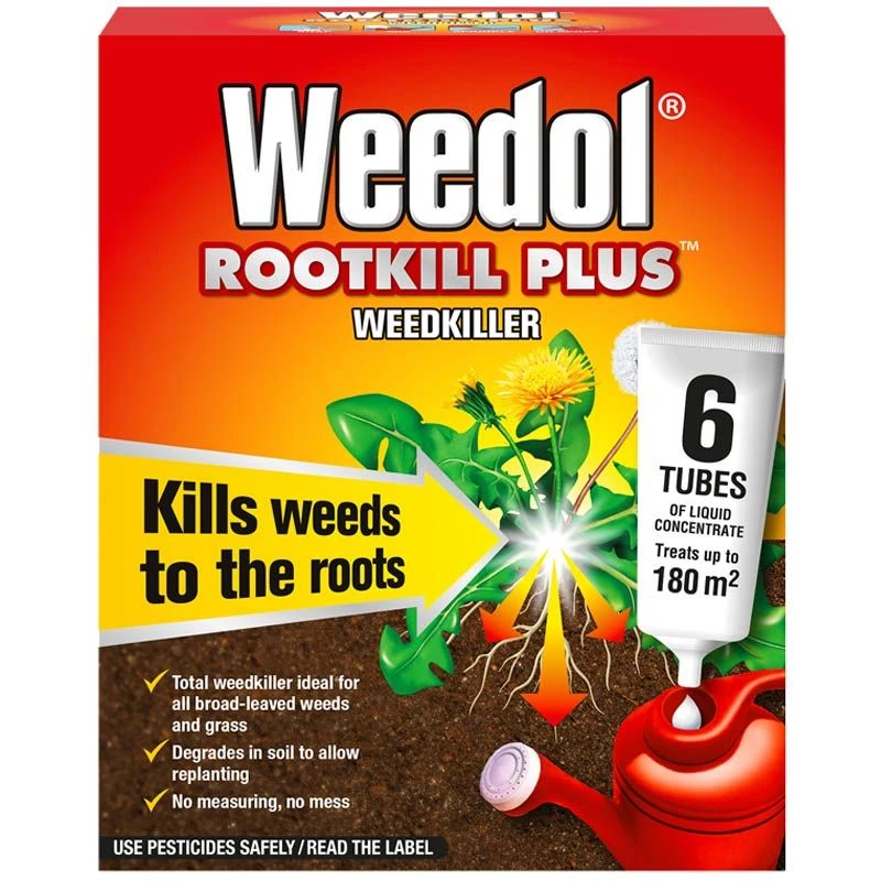 Weedol Rootkill Plus Weed Killer is a concentrated amateur total weed killer that kills broad-leaved garden weeds & grass weeds, with visible results in just 24 hours. This systemic liquid weed killer kills down to the root on tough garden weeds including nettles, thistles, docks, couch grass, dandelions & buttercup. Weedol Rootkill Plus degrades in the soil and treated areas can be re-planted 7 days after spraying.